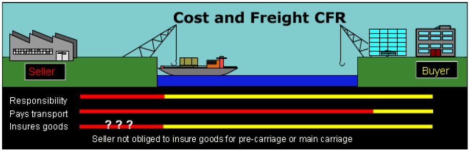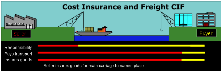 The seller must pay the costs of bringing the goods to the specified port. They also pay for insurance. The buyer is responsible for risks when the goods are loaded onto the ship.