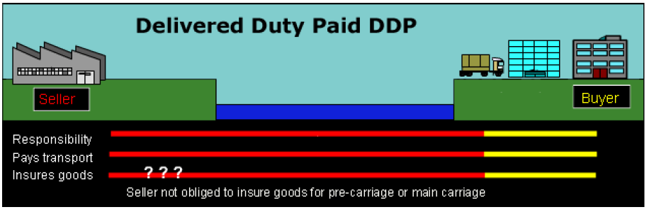 Seller pays all costs in bringing the goods to the destination including import duties and taxes. Unless the rules and regulations in the buyer's country are very well understood, DDP terms can be a very big risk both in terms of delays and in unforeseen extra costs, and should be used with caution.