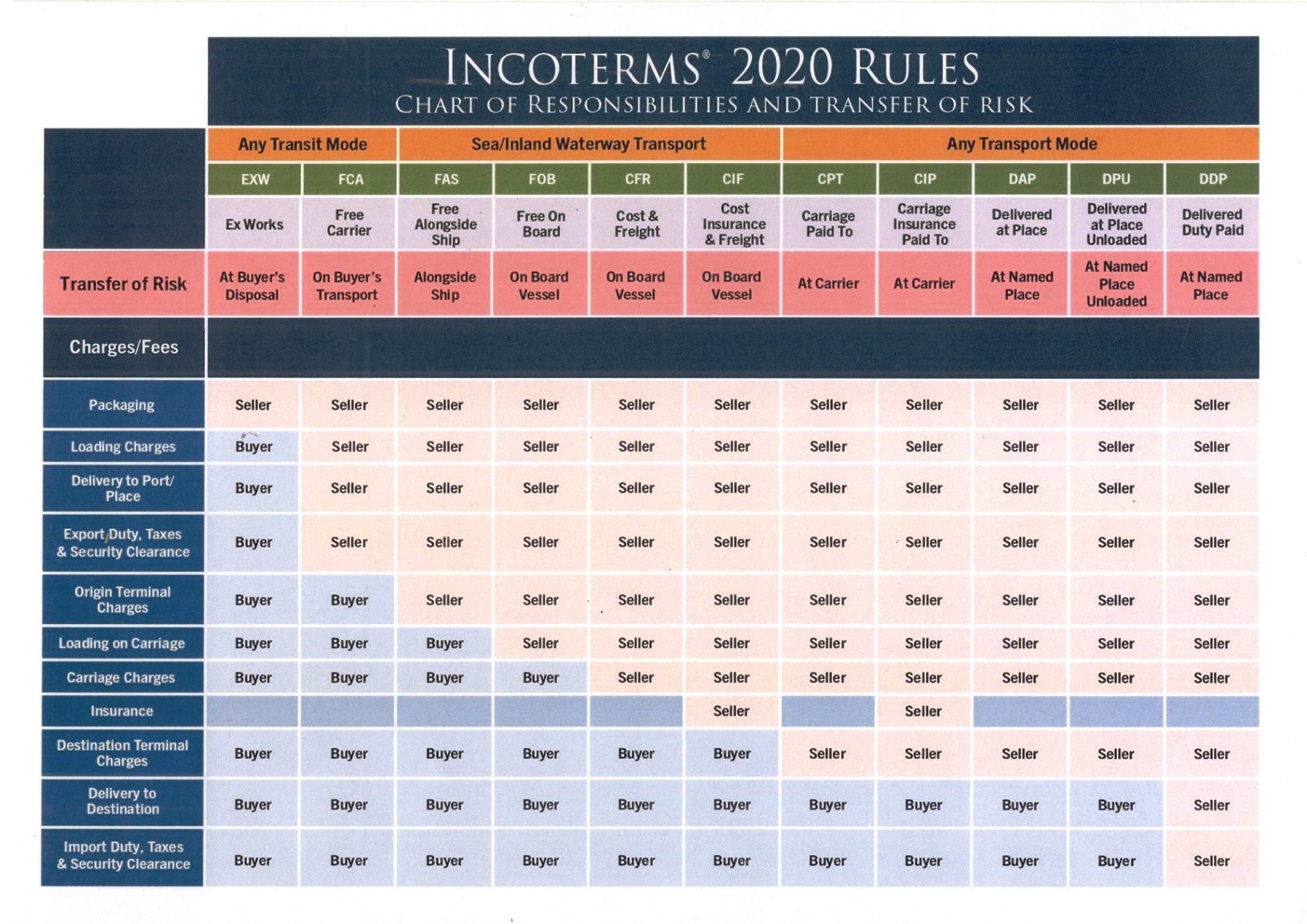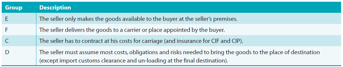 Incoterms are governed by the International Chamber of Commerce (ICC) in Paris and are grouped into four different categories. In Groups E and F the seller's obligations are minimal and the buyer must do most of the work and assume maximum risk. As we move to Group C the supplier's obligations become more extensive, however the buyer still assumes risks. As we move to group D the supplier makes most arrangements and assumes maximum risk, whereas the buyer must pay for and arrange import customs clearance and un-loading from the forwarder's vehicle at the final destination.